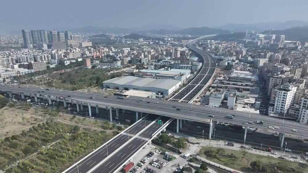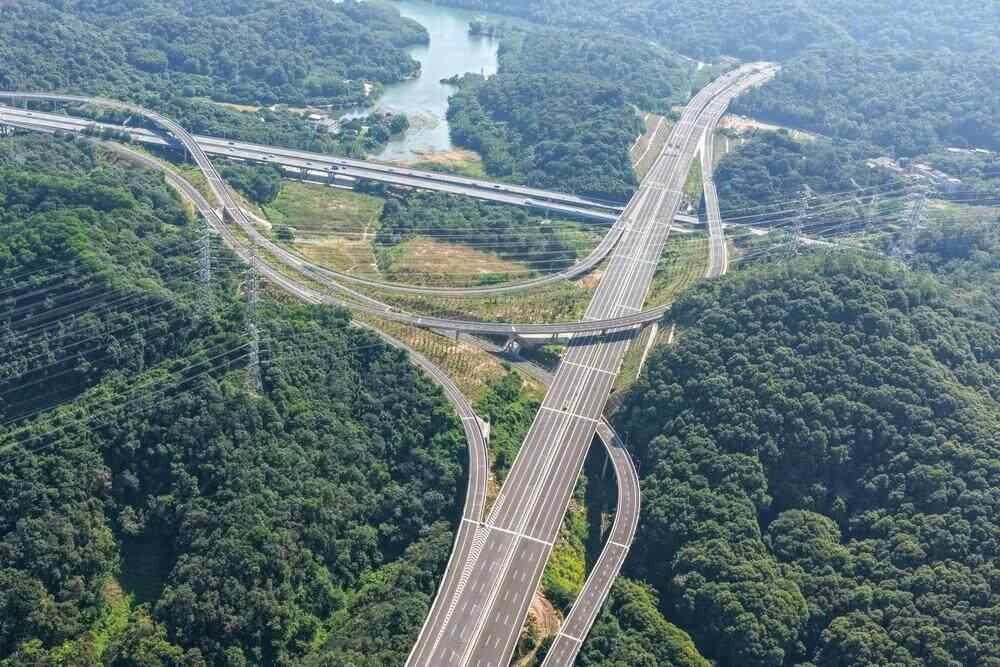 在高度城镇化区域,机场第二高速南段项目创新采用“廊道共享”模式,与106国道、大源北路、大观北路等既有廊道共线约10公里,以高架桥形式实现空间集约利用。其中,穿越白云区大源村的茶山枢纽互通立交,创新设计“高速主线—匝道—地方道路”三层共线结构(上层为高速公路主线,中层是连接其他高快速路网的匝道,下层为市政道路),在宽约50米的建筑群“夹缝”中开辟出立体通道,既避免近千户居民的拆迁,也为该建筑密集群保留了发展空间,成为城市空间3D立体化利用的典范,为未来城区交通建设提供宝贵经验。