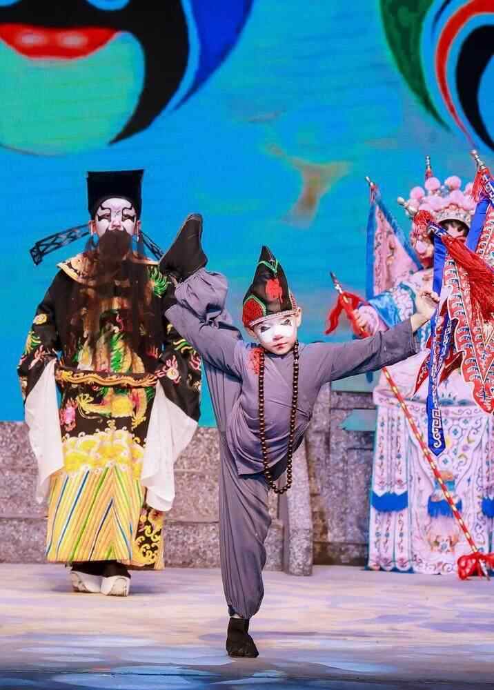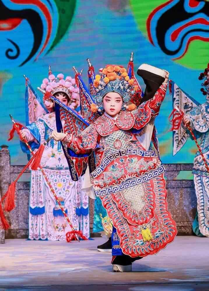 开幕式表演“打头阵”的是粤剧艺术博物馆少儿粤剧传承基地节目《小小红豆展英姿》。“小红豆”通过末、生、旦、净、丑、外、小、夫、贴、杂十大行当表演,展现粤剧角色阵容和角色特点,各色蟒、甲、褂、海青、皂衣、宫服以及各式盔头、纱帽、头巾、抹额等戏班行头一同展现。