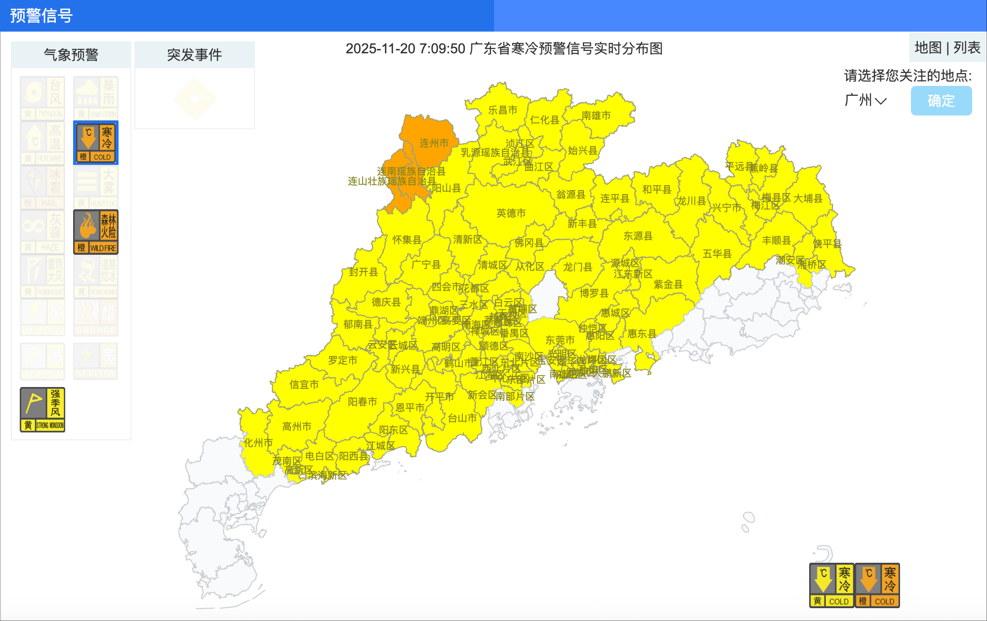 本次寒潮实力强劲,让南方多地经历“换季式”降温。上周还短袖在身,本周羽绒“加身”。截至20日早上7时许,连山、连南、连州寒冷橙色预警生效,广州、深圳、潮州、蕉岭、茂名等多个市县寒冷黄色预警生效中。