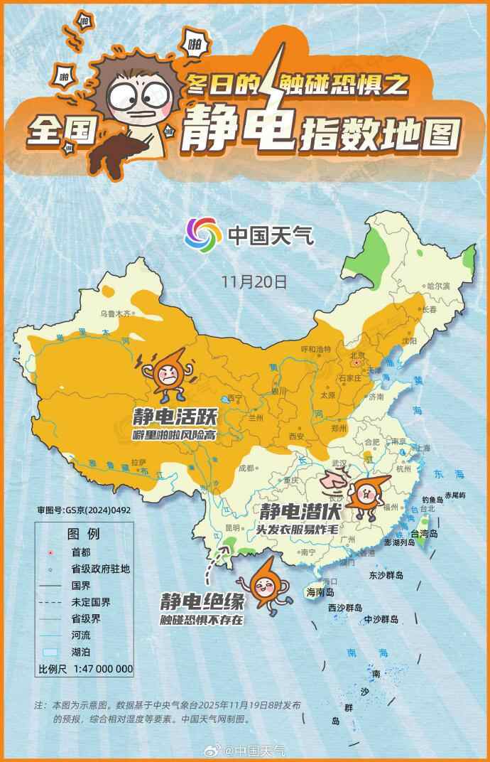 天干物燥,静电又返场了!当环境湿度小于30%的情况下,空气中的水汽难以传导电荷,原本容易消散的静电会大量停留在物体或人体表面,门把手、楼梯扶手、毛衣、头发等似乎处处带电,脱衣“噼里啪啦”、梳头“怒发冲冠”、触碰“电光石火”……从中国天气网推出的全国静电指数地图看来,超15省份“噼里啪啦”风险高,看看你家在不在“静电风险区”?