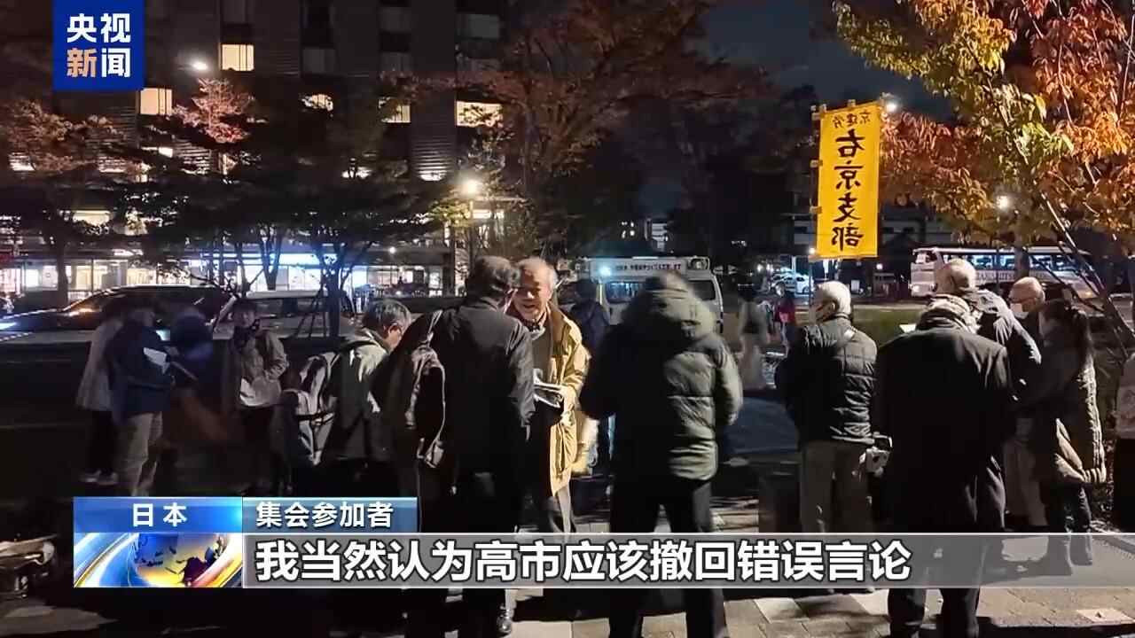 总台记者 何欣蕾:日本首相高市早苗近期涉台的错误言论在日本国内持续引发抗议和不满。19日在京都市役所前,当地民众自发举行集会,抗议高市的错误言行。像我身后的条幅,上面就写着“不要拿台湾作借口,挑起战争,高市早苗撤回言论”,以此来表达民众的心声。