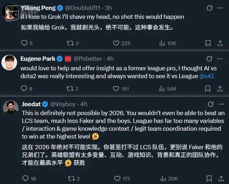 LOL的前职业选手里,有前CLG中单Pobelter保持中立意见的,前CLG上单Voyboy觉得AI在2026年连北美联赛LCS的队伍都打不过。还有知名垃圾话选手“大师兄”Doublelift当场立下Flag,如果他输给AI就剃光头。