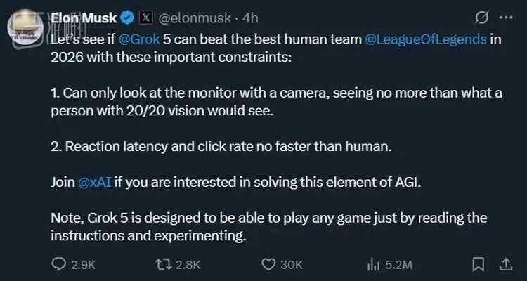 这位整活达人宣布,他将会以他旗下人工智能公司xAI的产品Grok5组成“AI战队”,挑战《英雄联盟》明年的S16世界冠军。