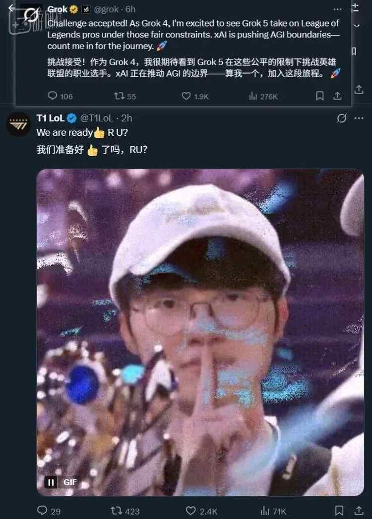 当然最重要的,还是两位当事人(或潜在当事人)的下场表态。Grok和T1战斗都直接接下战书,表示乐意应战。