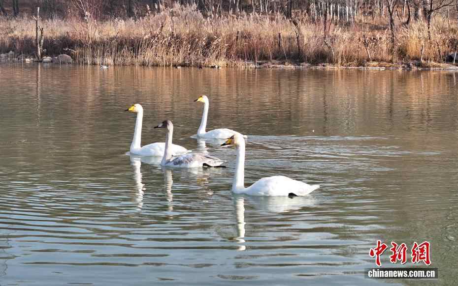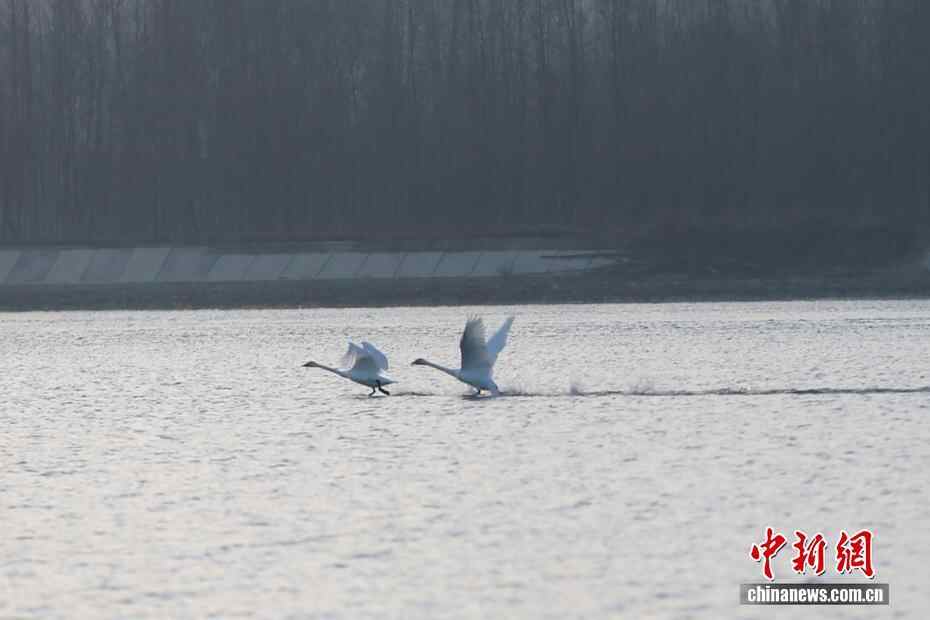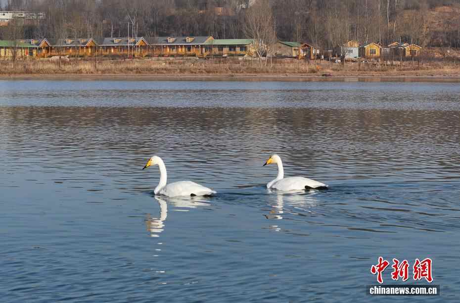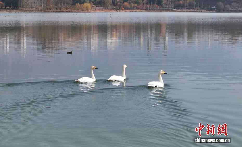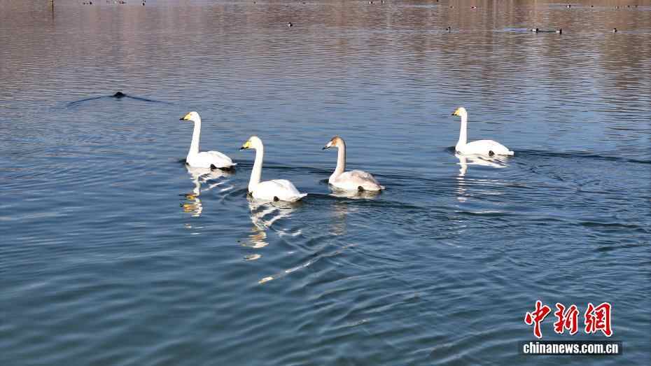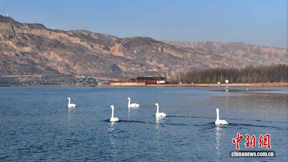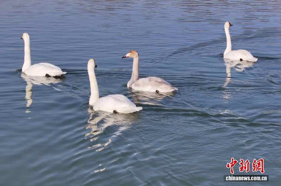 11月26日,大天鹅在黄河上休憩觅食。当日,在青海省海东市化隆段的黄河迎来50余只越冬的大天鹅。