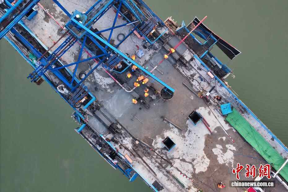 11月26日,经过建设工人12小时的连续浇筑作业,四川成都至达州至重庆万州高速铁路(简称“成达万高铁”)渠江特大桥顺利合龙。该桥采用双线高铁预应力混凝土箱梁矮塔斜拉桥设计,结构设计科学合理。成达万高铁是中国“八纵八横”高速铁路网沿江通道的重要组成部分,正线全长477公里,设计时速350公里。图为大桥混凝土浇筑完成,工人师傅正在清理作业面。(无人机照片)