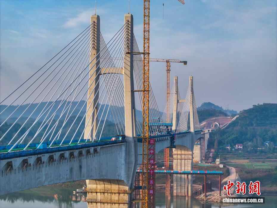 11月26日,经过建设工人12小时的连续浇筑作业,四川成都至达州至重庆万州高速铁路(简称“成达万高铁”)渠江特大桥顺利合龙。该桥采用双线高铁预应力混凝土箱梁矮塔斜拉桥设计,结构设计科学合理。成达万高铁是中国“八纵八横”高速铁路网沿江通道的重要组成部分,正线全长477公里,设计时速350公里。图为加紧建设的成达万高铁跨越渠江段。(11月25日无人机照片)