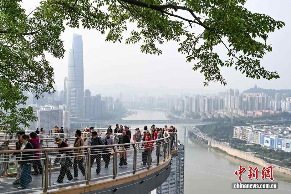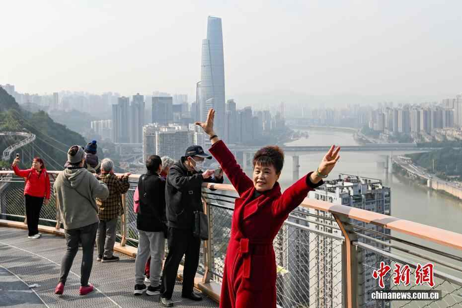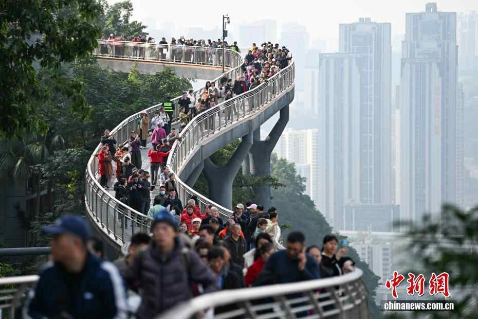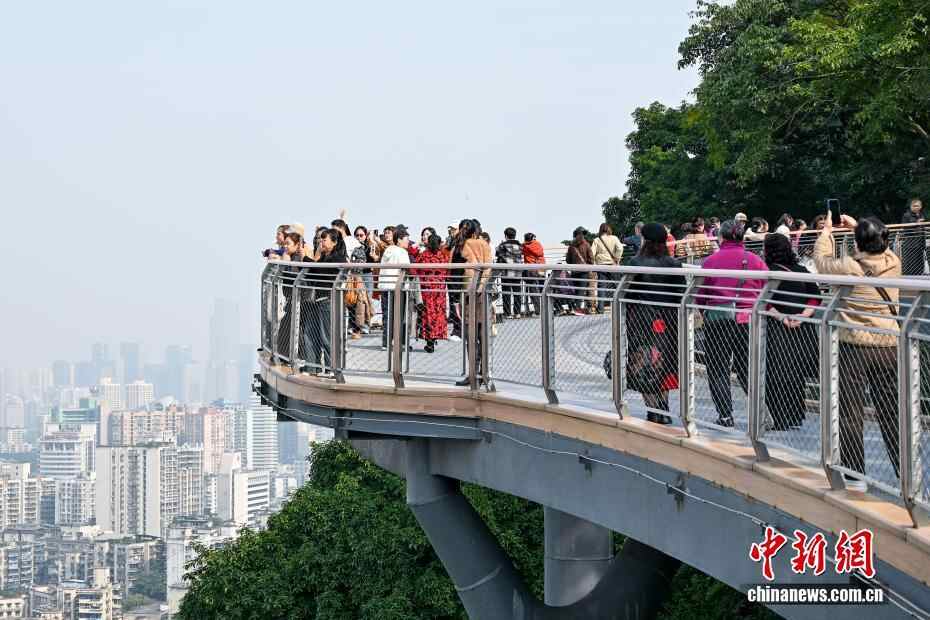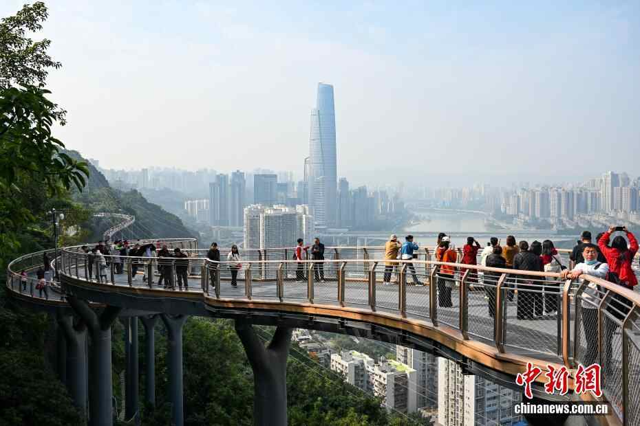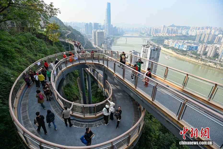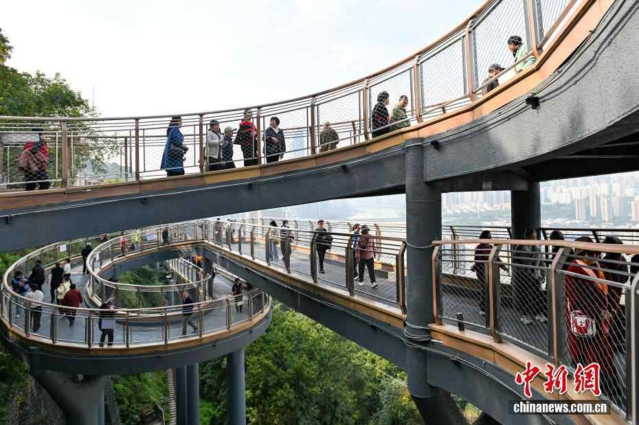 11月26日,民众在重庆半山崖线鹅岭栈桥观光游览。重庆鹅岭栈桥位于半山崖线步道鹅岭段,连接鹅岭公园和佛图关公园,全长约460米,最大高度达28米。栈桥依山就势、临崖而建,蜿蜒穿行于崖壁林间,可俯瞰嘉陵江的壮丽景色,自正式开通以来吸引众多市民游客前来“打卡”游玩。