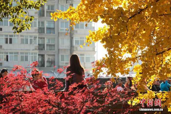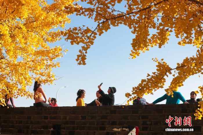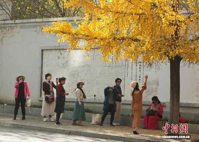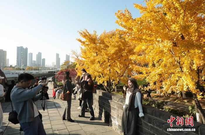 11月26日,湖北武汉,武昌首义路至起义门沿线路段上的银杏树枝叶交织,在阳光下熠熠生辉,宛如一片金色的海洋,吸引了众多市民来此拍照留影,享受深秋暖阳。中新社记者 张畅 摄