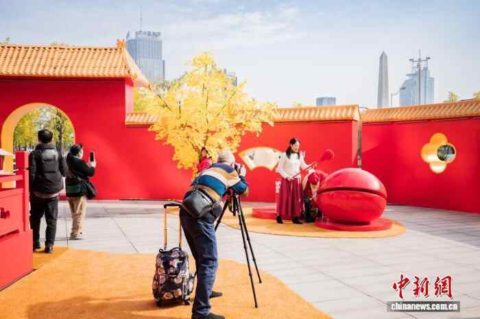 图为市民游客以“红墙限定皮肤”为背景“打卡”拍照。黄维正 摄