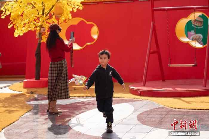 图为孩童在“红墙限定皮肤”处玩耍。黄维正 摄