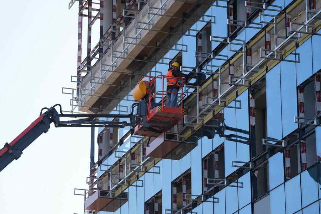 11月26日,中铁十一局建设者在浙江工业职业技术学院新昌学院综合楼进行幕墙施工。