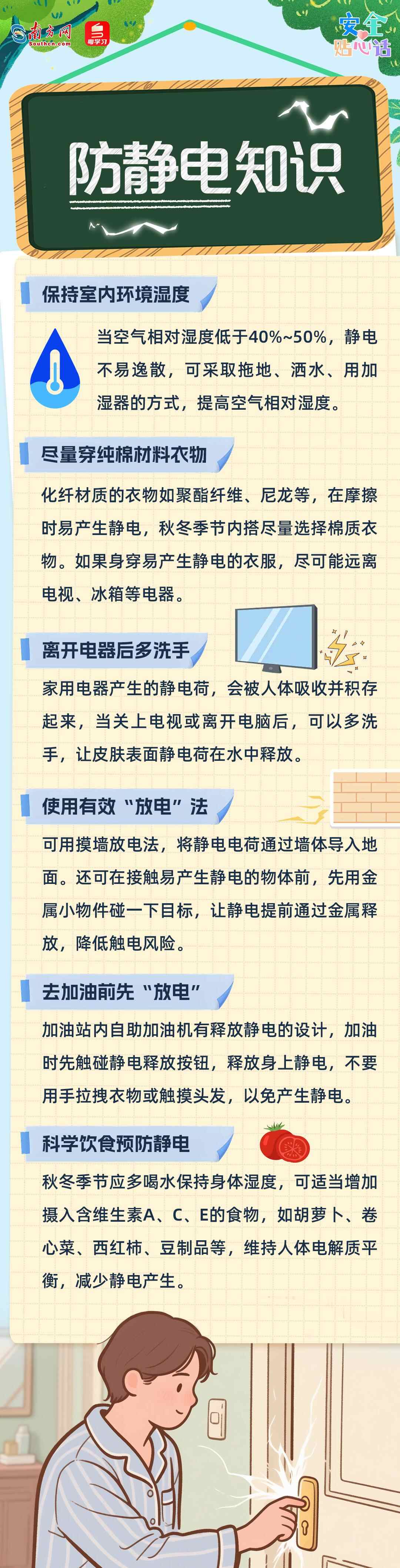 天干物燥的秋冬季节很容易产生静电,别看静电能量不大,一旦接触易燃易爆物质,就可能引发火灾。因此,我们还需警惕静电“惹火”。