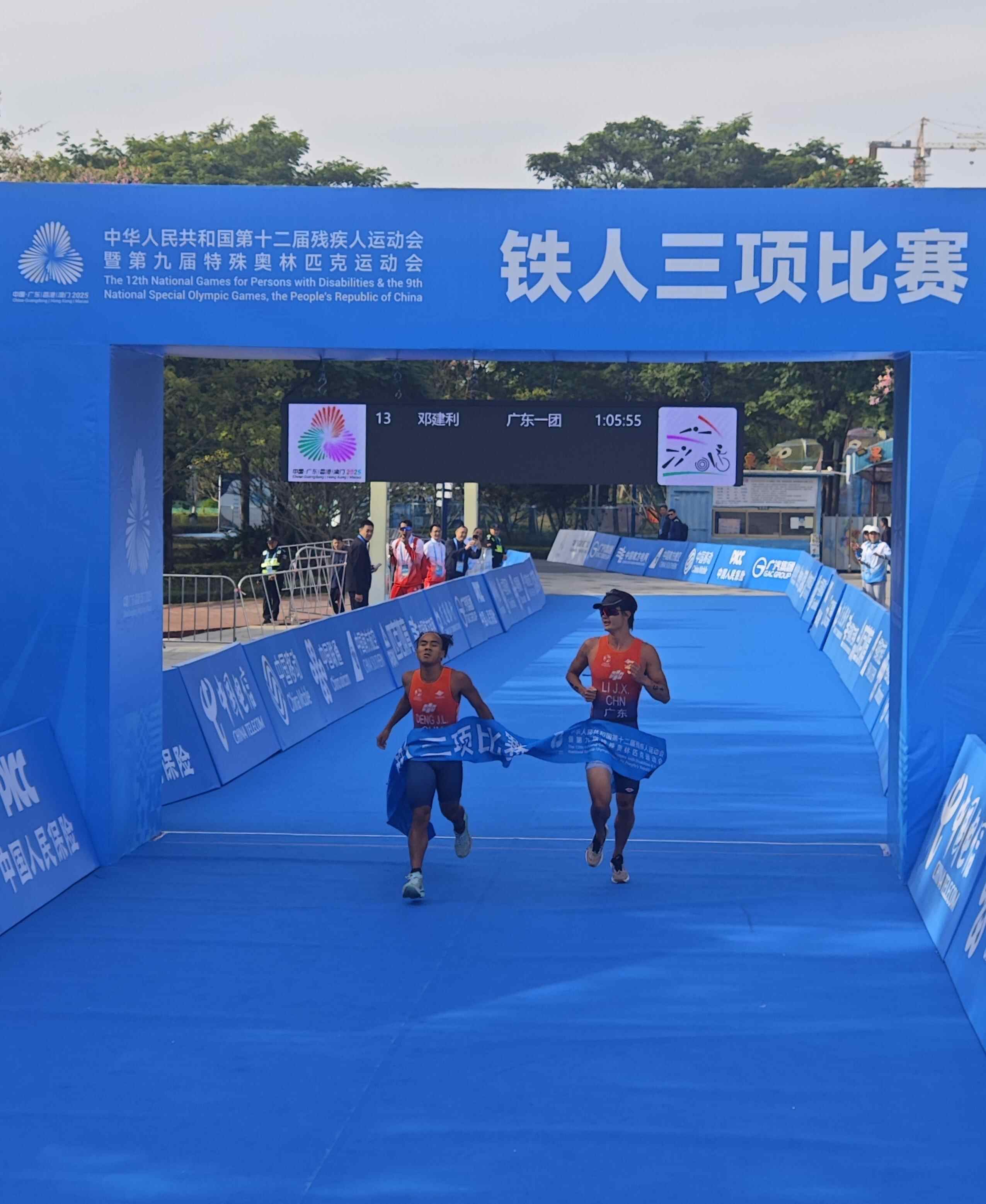 当天上午,来自广东省残疾人铁人三项队的队员邓建利(引导员李嘉兴)夺得残特奥会铁人三项比赛男子PTVI2组(视力障碍)冠军,这也是本届残特奥会铁人三项比赛的首金,同样也是我国历史上首个残疾人铁人三项比赛金牌。