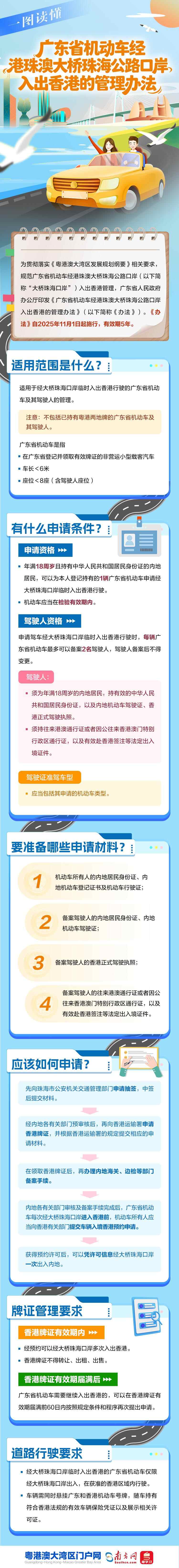 “粤车南下”的其中一项政策,《广东省机动车经港珠澳大桥珠海公路口岸入出香港的管理办法》已正式实施。该项政策亮点丰富,涵盖了车辆资质、备案流程、申请材料及通关须知等核心信息。若想清晰了解相关规定,以下“一图读懂”助你轻松规划跨境出行,实现大湾区顺畅通行!