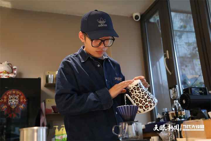 “吾界咖啡”培训部经理莫斯竣正在制作咖啡