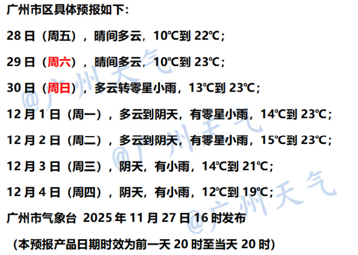 @广州天气 预计,28日-29日,广州市晴朗干燥,早晚气温低,昼夜温差大;30日云量增多,并伴有零星小雨。