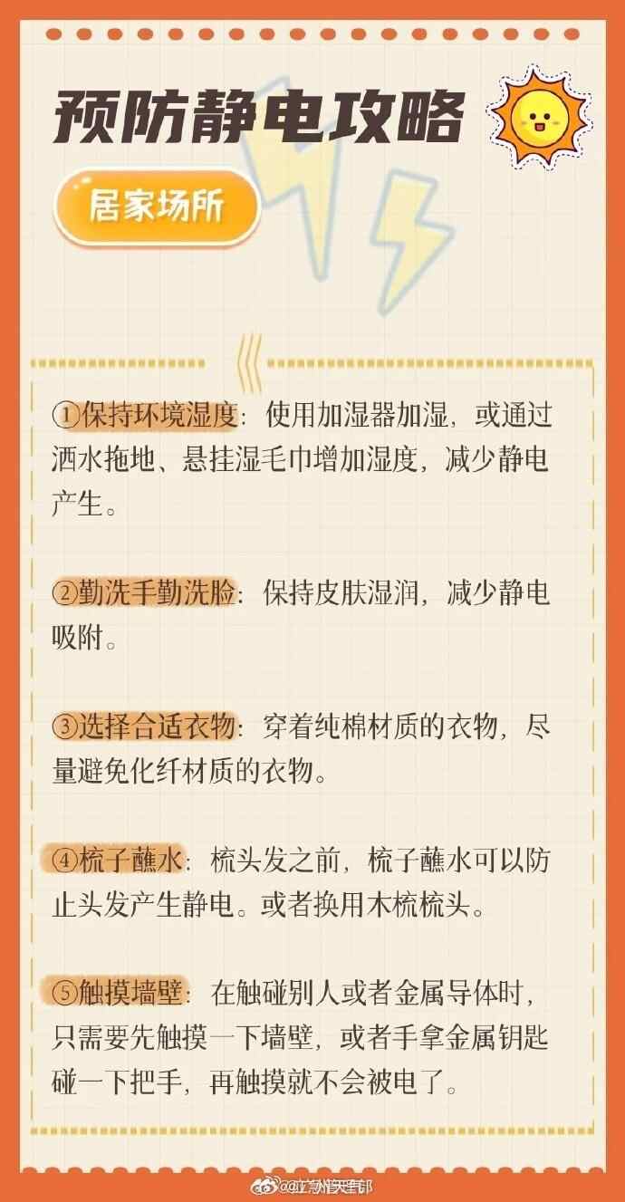 此外,最近不少广东的小伙伴表示自己要被电麻了!穿脱外衣时被“电”、拿杯子喝水被“电”、一碰门把手被“电” ……如何预防静电,戳图了解↓