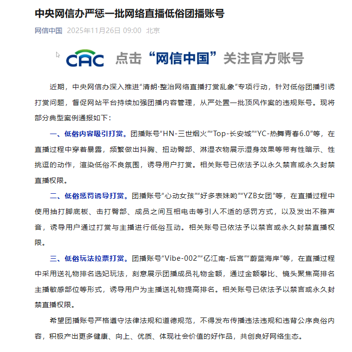 近期,中央网信办深入推进“清朗·整治网络直播打赏乱象”专项行动,针对低俗团播引诱打赏问题,督促网站平台持续加强团播内容管理,从严处置一批顶风作案的违规账号。现将部分典型案例通报如下: