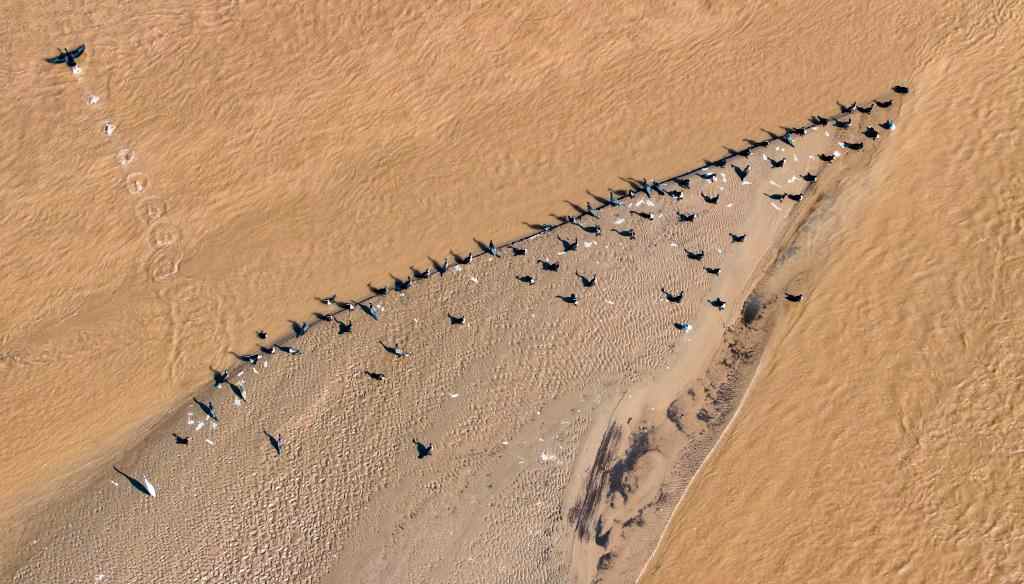 11月4日,在位于宁夏灵武市境内的黄河,候鸟在河滩上驻足栖息(无人机照片)。新华社记者 杨植森 摄