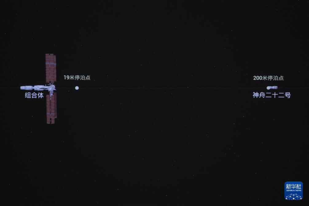 这是11月25日在北京航天飞行控制中心拍摄的神舟二十二号飞船与空间站组合体交会对接过程的实时画面。