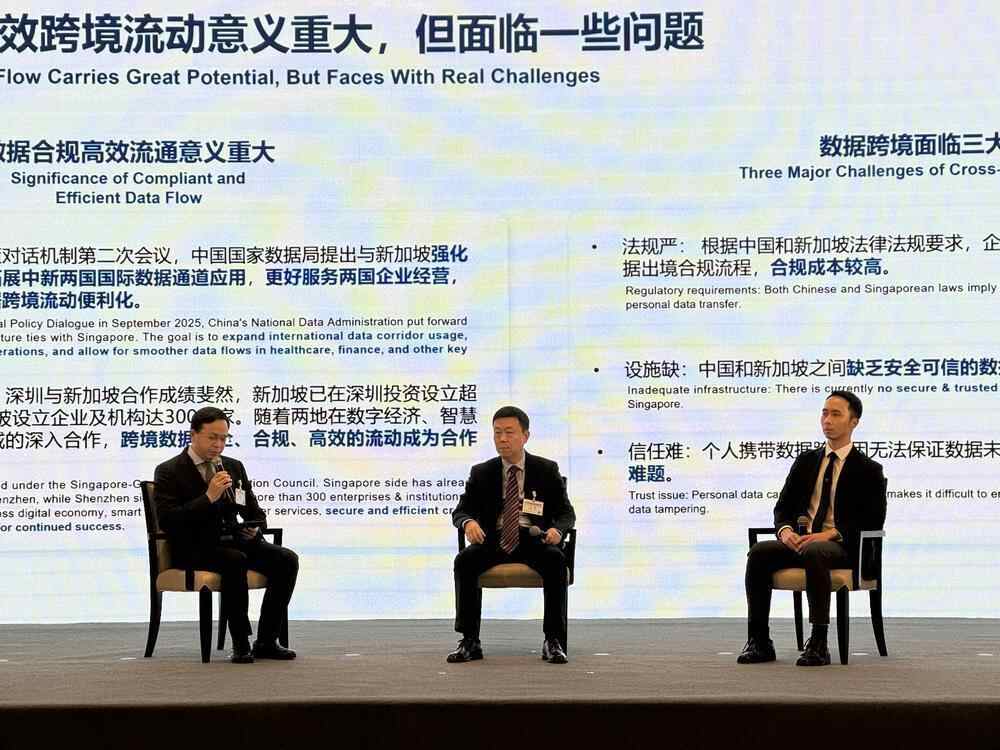 跨境数据联通是许多在华企业和出海企业共同面临的问题。深圳市前海管理局常务副局长黄晓鹏,微众银行副总裁江旻,新加坡Accredify首席执行官与创始人柯政纬,围绕跨境数据验证平台建设与成效作联合分享。