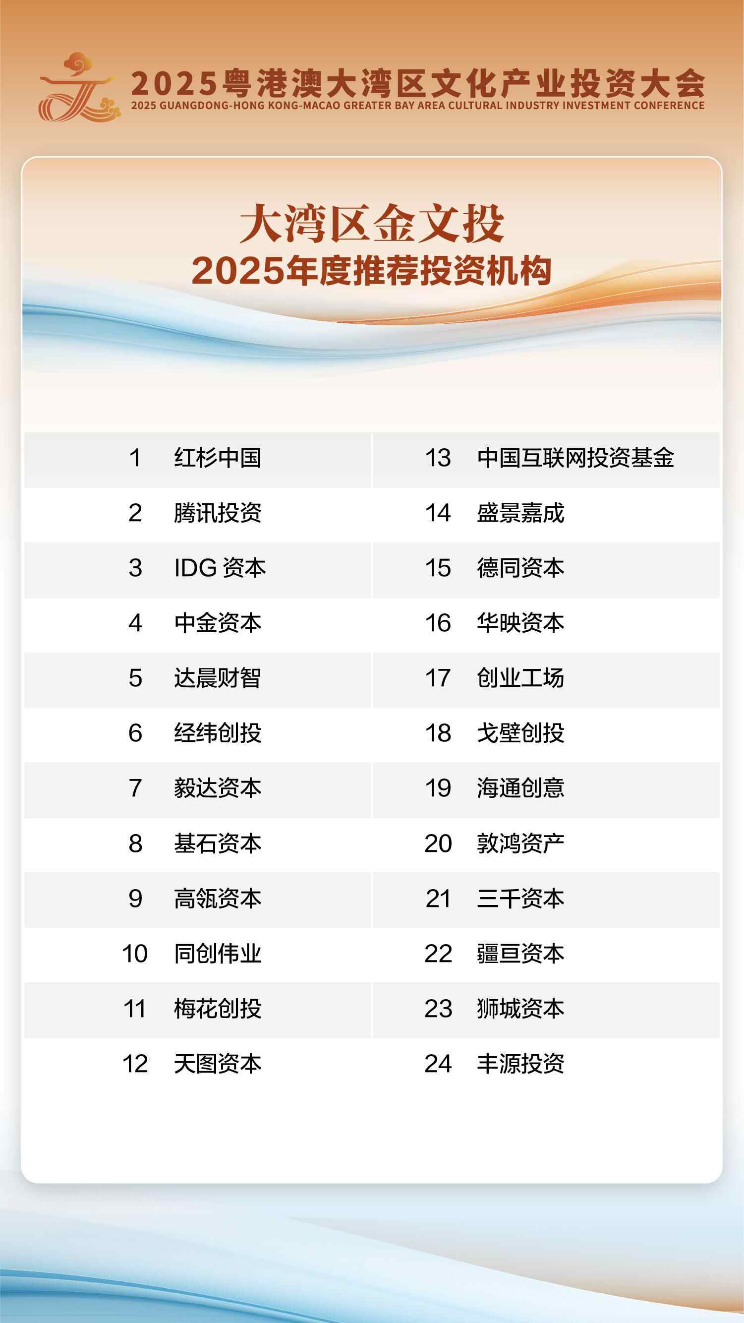 大湾区文投会高水平搭建“为资金找项目,为项目找资金”平台,吸引超过100家知名金融投资机构的200多名投资人到会。本次评选立足湾区,面向全国,对重点投资文化产业领域的200多家投资机构按照基金规模、投资项目数量及文化产业投资成功案例等规则进行筛选,最终选出24家投资机构为“大湾区金文投2025年度推荐投资机构”。