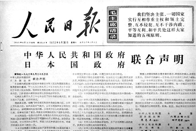 1972年,《中日联合声明》签订,两国正式建立外交关系。联合声明共有三处涉及台湾问题:一是在前言部分写明,“日本方面重申站在充分理解中华人民共和国政府提出的‘复交三原则’的立场上,谋求实现中日邦交正常化这一见解”;二是在声明第二条写明,“日本国政府承认中华人民共和国政府是中国的唯一合法政府”;三是在声明第三条写明,“中华人民共和国政府重申:台湾是中华人民共和国领土不可分割的一部分。日本国政府充分理解和尊重中国政府的这一立场,并坚持遵循波茨坦公告第八条的立场”。