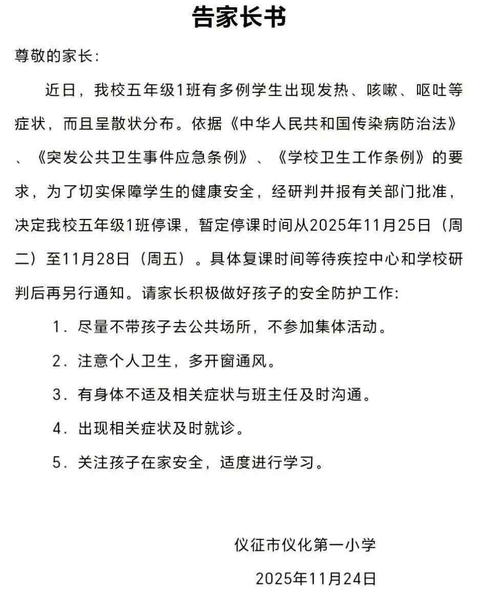 根据网友发的《告家长书》显示,扬州仪征仪华第一小学一班级有多例学生出现发热、咳嗽、呕吐等症状,经批准决定该班级停课4天。
