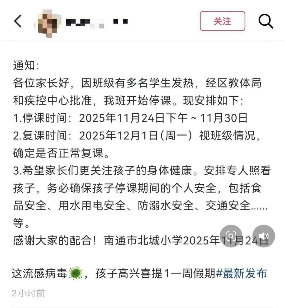 除此以外,南京、南通等地也有多名家长表示孩子所在班级停课。