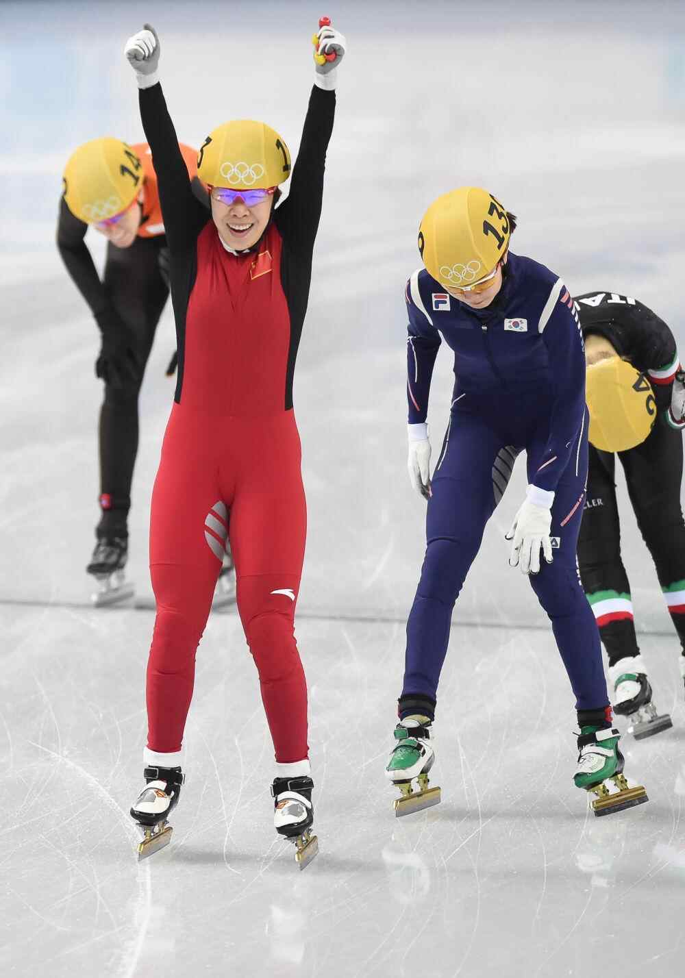 2014年2⽉15⽇,在2014年索契冬奥会短道速滑⼥⼦1500⽶决赛中,周洋(左⼆)冲过终点后庆祝,她以2分19秒140的成绩夺得该项⽬冠军。新华社记者 王昊⻜ 摄