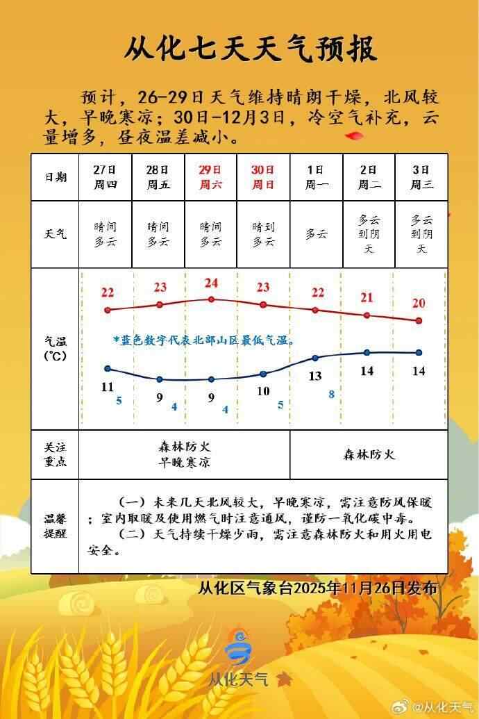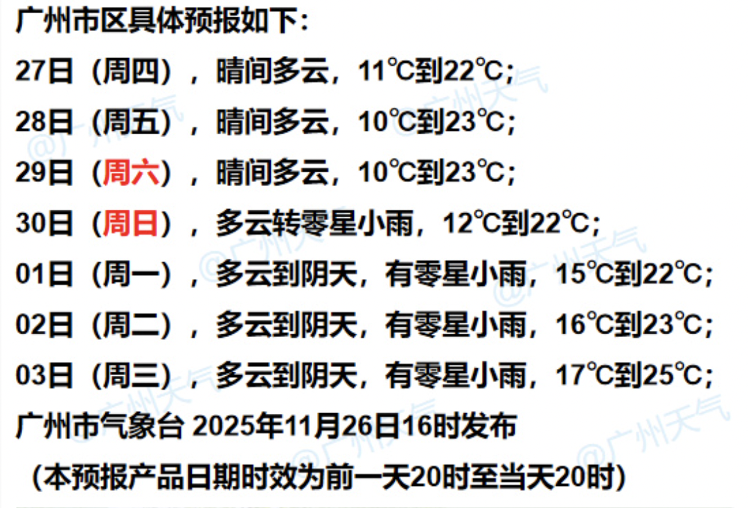 根据广州市气象台及从化区气象台11月26日傍晚的预报,受弱冷空气影响,未来一段时间广州早晚时段的气温将继续下降。其中28日至29日,广州市区最低气温将降至10℃左右,北部山区最低气温可达4℃。