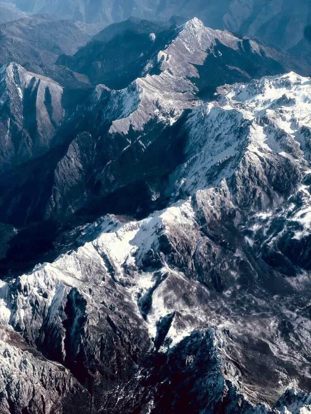 如此景象,已非山水,而是山河,得壮阔苍凉境。西部无山水,山河动地来。程麟来时在飞机上拍得一图,只见群山充天塞地,皆嶙峋斩绝,威猛如虎,刚烈似貙,因无草木,风骨尽见,又有微雪拭其锋,似为巨手所办,大见凌轹山川意。昨天李师傅说,经桑科草原,越群山,约六十里开外,便是青海——那离昆仑更近了。