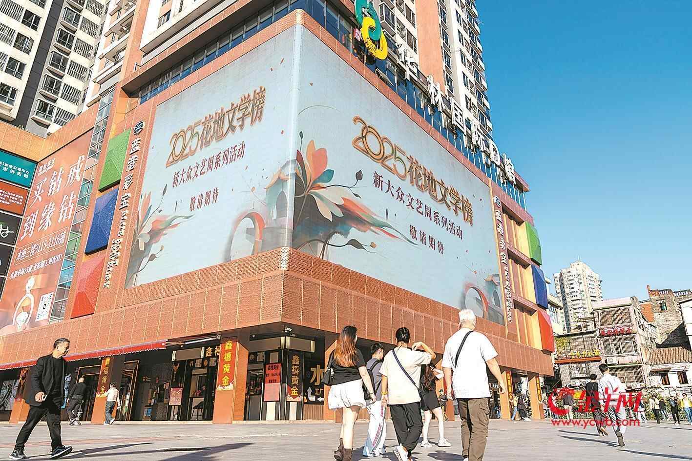 11月26日至29日,由羊城晚报报业集团联合广州市荔湾区政府等共同主办的“2025花地文学榜·新大众文艺周”系列活动将在广州、深圳、东莞举行。24日起,“2025花地文学榜·新大众文艺周”推出户外宣传视频,在广州华林国际C、D馆及1906科技园扬韬广场等荔湾户外大屏滚动播放,以文学力量点燃城市活力与热情。