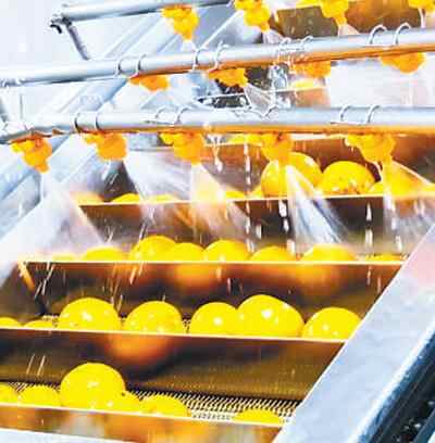 在浙江艾佳果蔬开发有限责任公司,胡柚正在生产线上进行清洗。徐林辉摄(人民视觉)