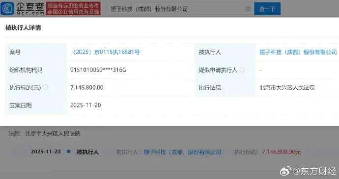 11月25日,据@东方财经消息:企查查APP显示,11月20日,锤子科技(成都)股份有限公司新增一则被执行人信息,执行标的约715万元,执行法院为北京市大兴区人民法院。
