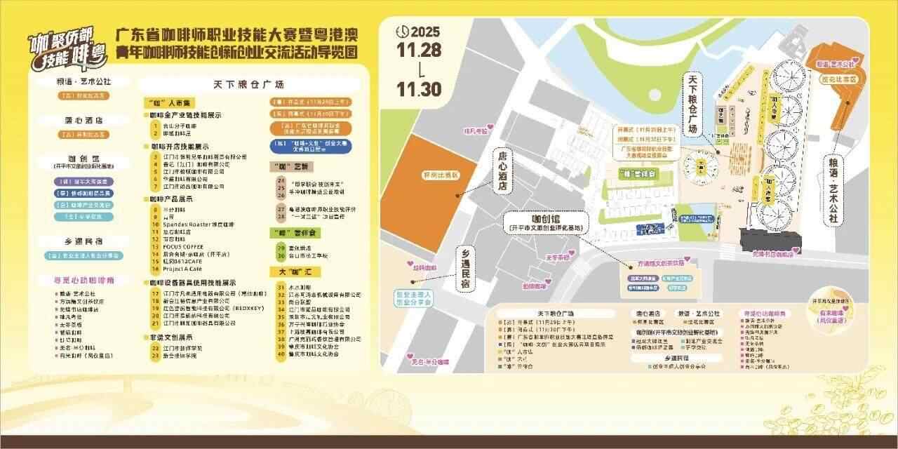 本次市集核心活动集中在开平塘口镇天下粮仓广场及开平市文旅创业孵化基地,活动时间从每天9时持续至20时(部分活动时间略有调整)。作为市集的重要组成部分,咖啡技能体验区将完整呈现“从种子到杯子”的全产业链流程——从咖啡种植、生豆处理,到烘焙加工、冲调技艺及器具制造,配合专业器具演示,让咖啡小白也能快速建立对咖啡产业的全方位认知。
