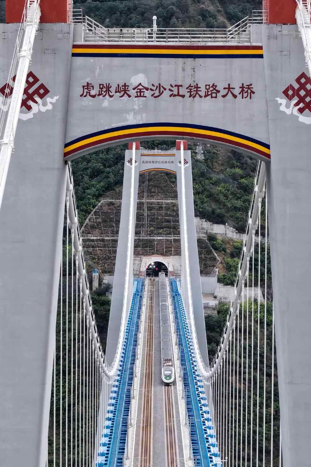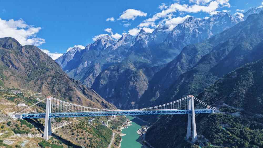 这是11月21日拍摄的虎跳峡金沙江铁路大桥。大桥全长882.5米,起于玉龙雪山隧道出口,止于哈巴雪山隧道进口,是丽香铁路的重点控制性工程(无人机照片)。