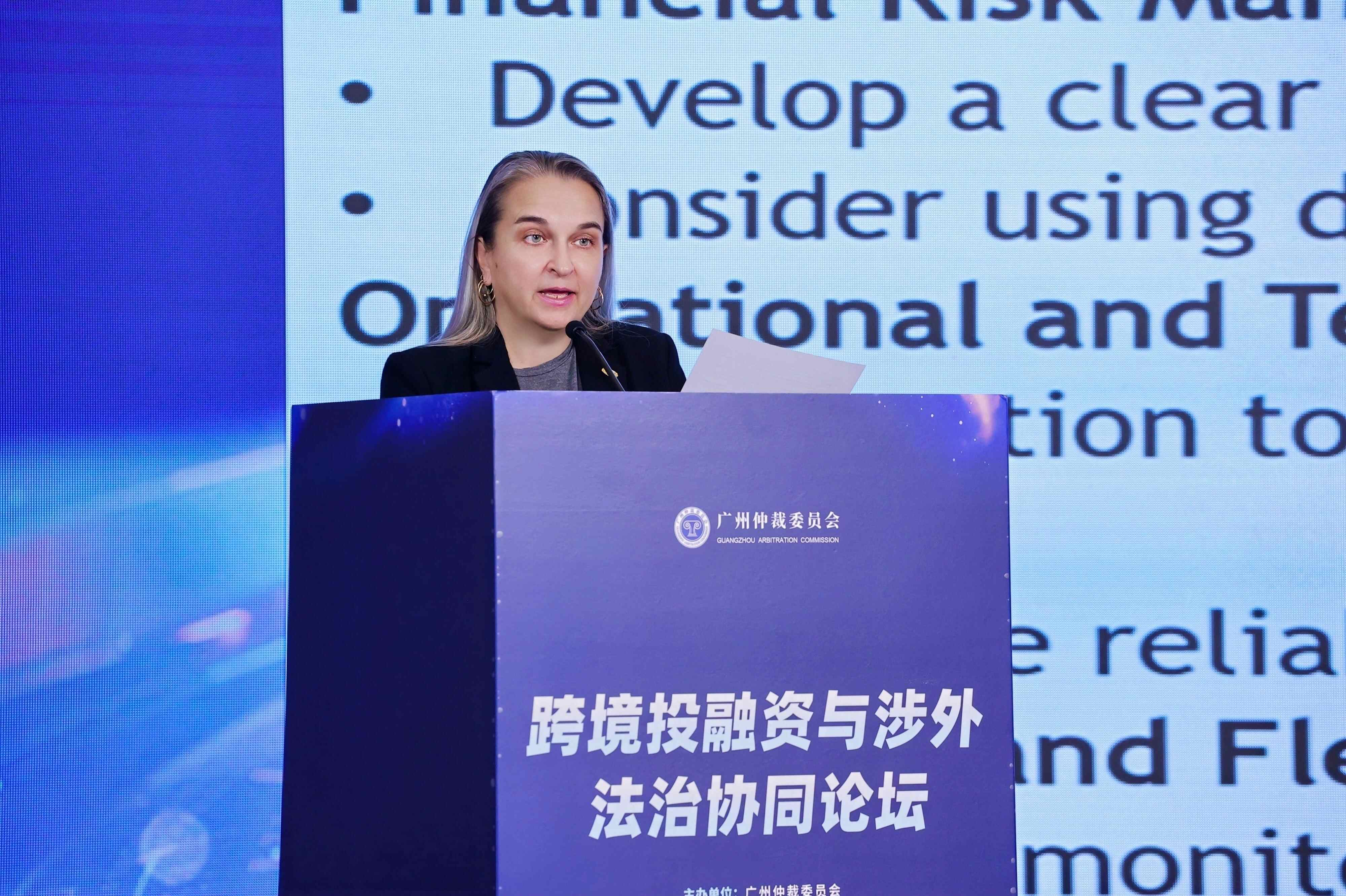 她建议企业构建多元化投资策略,开展精细法律尽调,并优先选择国际仲裁作为争议解决方式。她还详细介绍了俄罗斯仲裁制度在临时措施强制执行、程序电子化等方面的改革,并强调了俄联邦工商会国际商事仲裁院与广仲日益紧密的合作关系。