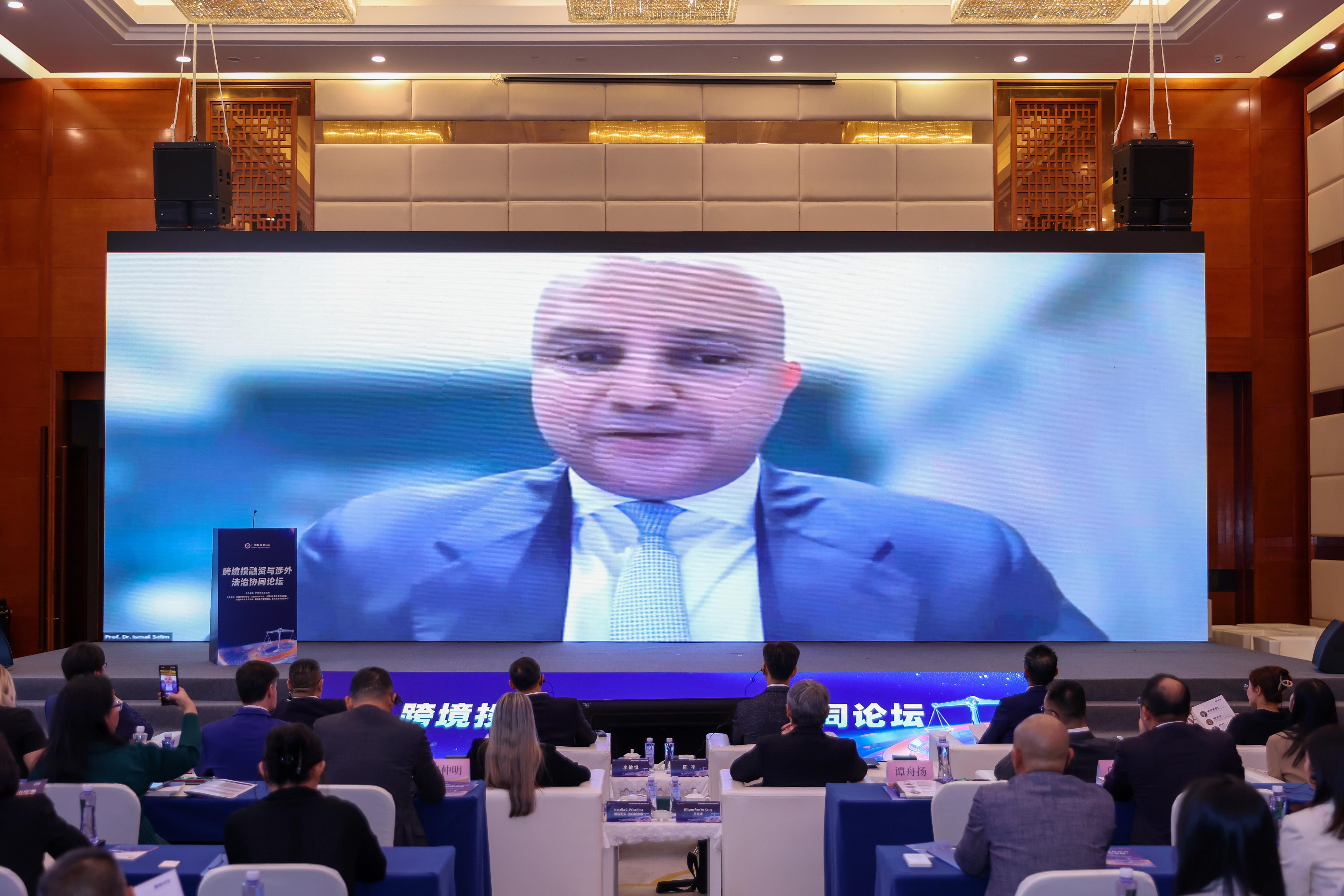 开罗国际商业仲裁区域中心主任Ismail Selim(伊斯梅尔·斯莱姆)通过视频连线的方式进行了发言,他系统分析了在共建“一带一路”乃至金砖合作机制框架下中国对埃及投资的机遇与挑战,并重点介绍了埃及吸引外资的法律创新实践,如“金许可证”制度和外资土地所有权改革。
