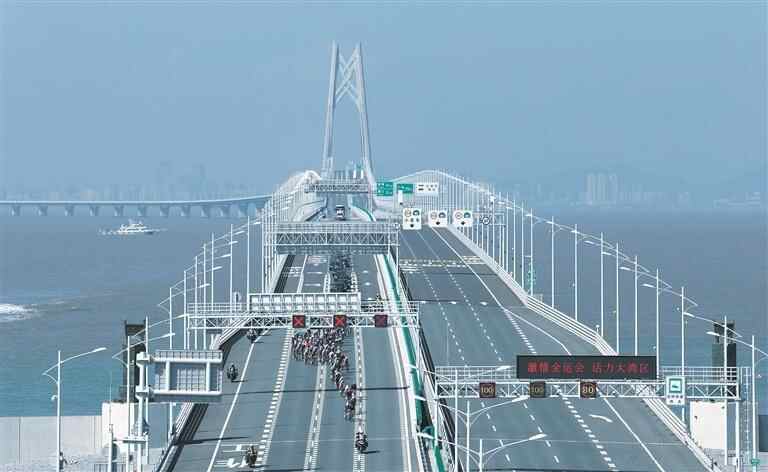 11月8日,第十五届全国运动会公路自行车男子个人赛参赛选手在港珠澳大桥上骑行。新华社发