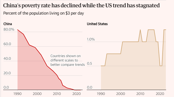文章引用世界银行的数据指出,1990年时,中国还有9.43亿人每日生活费不足3美元(以2021年美元计价);到2019年,这一数字已经为零。而美国却并未取得如此成效。目前有超过400万美国人——占美国总人口的1.25%——依靠每日不足3美元的收入勉强度日,这一数字是35年前的三倍多。