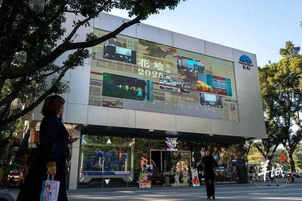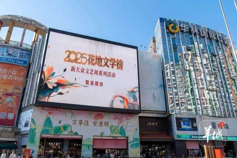 “2025花地文学榜·新大众文艺周”宣传视频点亮广州荔湾繁华地段户外大屏,在熙攘人流中引发市民关注,成为街头一景。