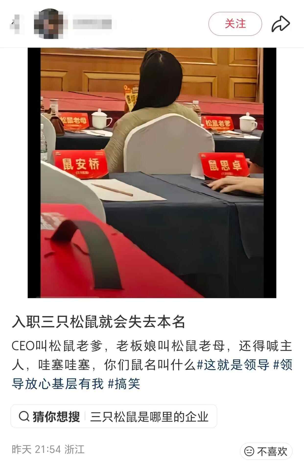 日前,有网友在社交平台发帖称,在入职三只松鼠后会失去本名,因为员工会将自己的名字改为“鼠某某”。据该网友发布的照片显示,在一会议现场上,每个座位都摆放着以“鼠”字开头的名牌,如“松鼠老爹”“松鼠老母”等。据介绍,“松鼠老爹”即公司创始人章燎原。