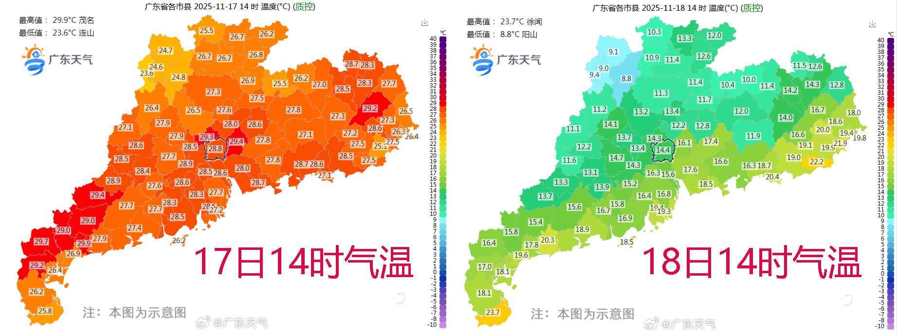 昨天(11月18日),广东气温明显下降,14时大部气温在10~20℃,同比前一天下降8~15℃。