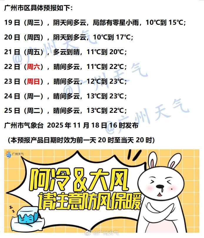 广州有阿冷+阿雨+北风来报到,开启速冻换季模式。怕冷星人再坚持两天,周五开始阳光更多点,气温也逐渐回升。
