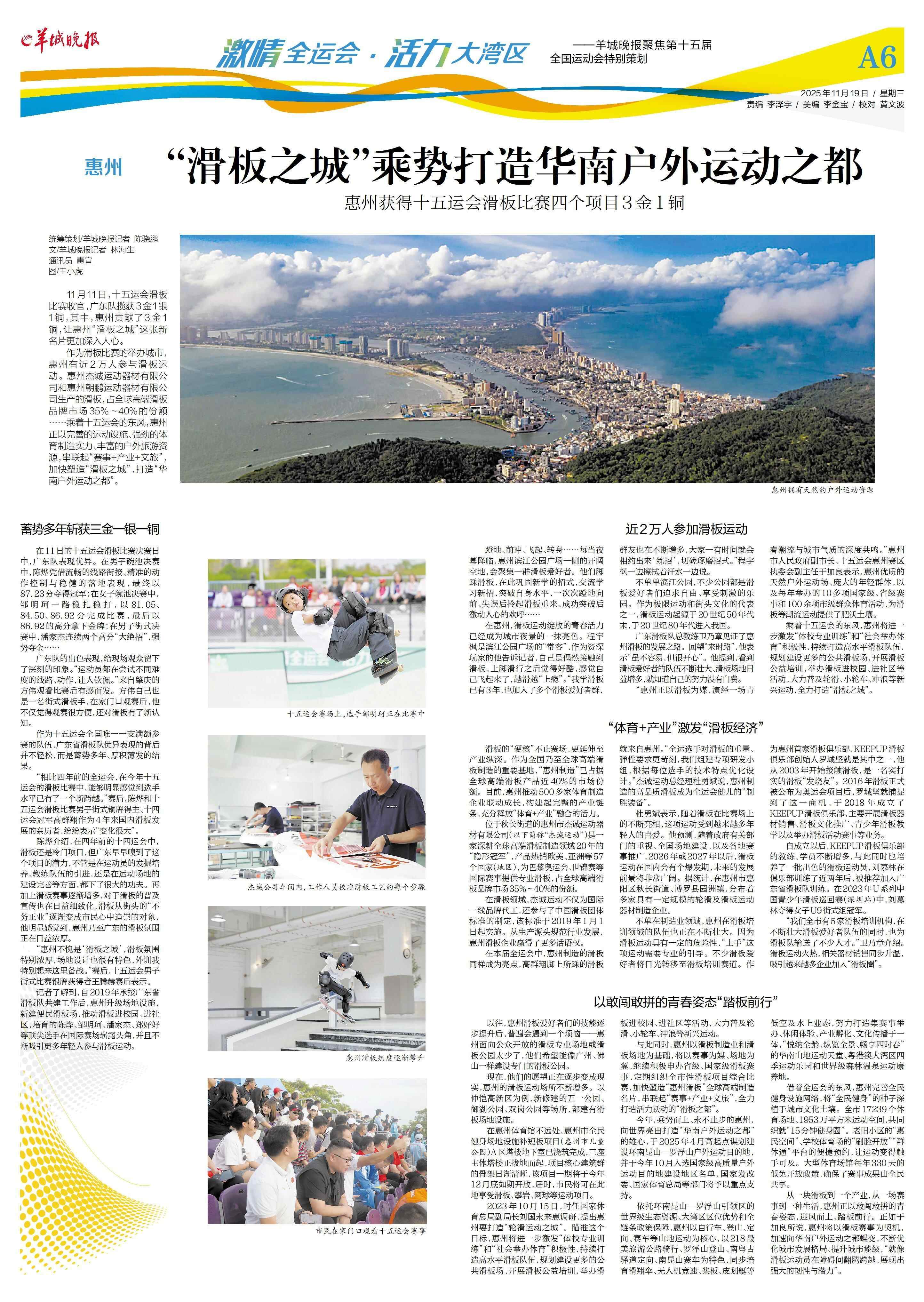 作为滑板比赛的举办城市,惠州有近2万人参与滑板运动。惠州杰诚运动器材有限公司和惠州朝鹏运动器材有限公司生产的滑板,占全球高端滑板品牌市场35%~40%的份额……乘着十五运会的东风,惠州正以完善的运动设施、强劲的体育制造实力、丰富的户外旅游资源,串联起“赛事+产业+文旅”,加快塑造“滑板之城”,打造“华南户外运动之都”。