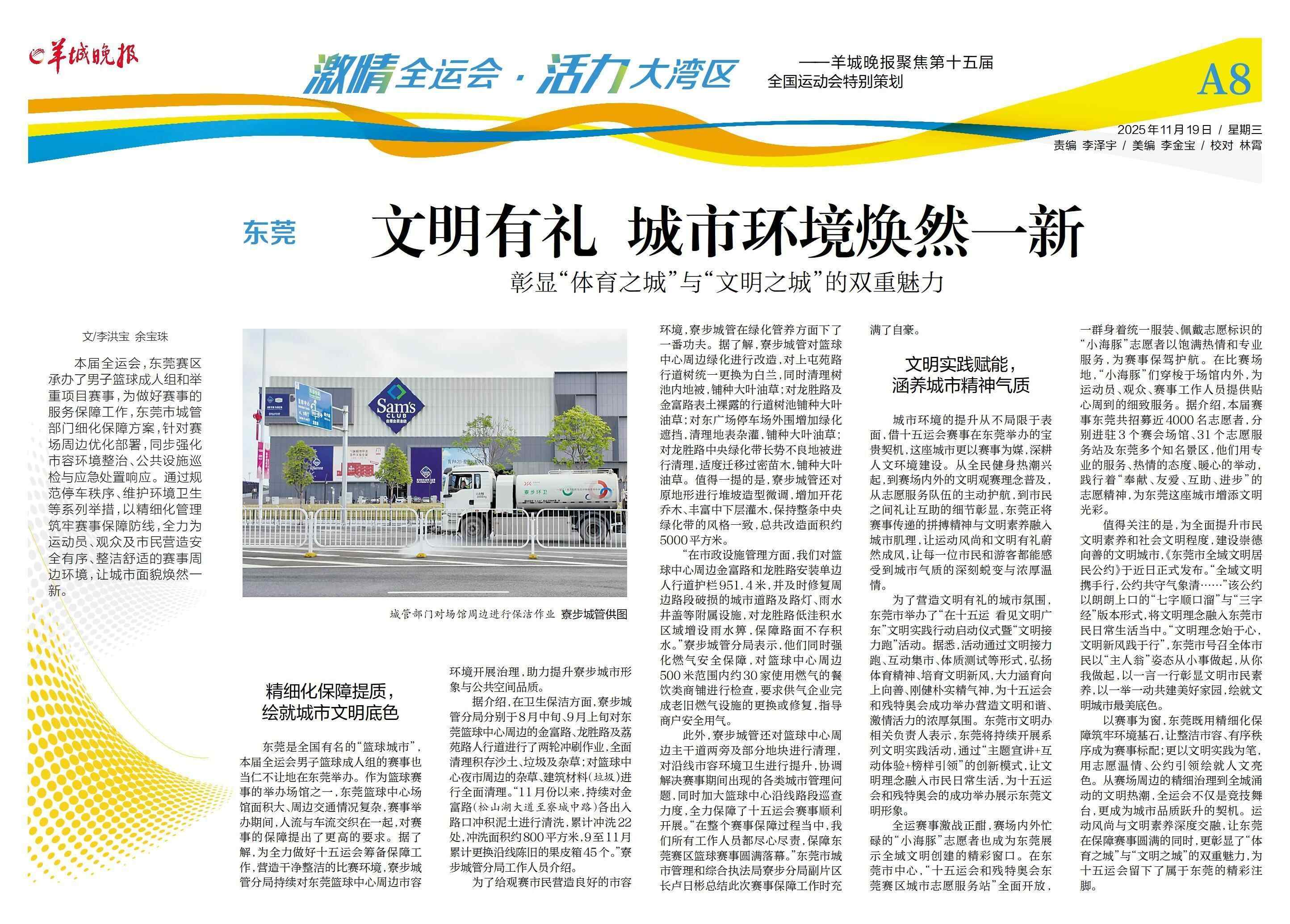 本届全运会,东莞赛区承办了男子篮球成人组和举重项目赛事,为做好赛事的服务保障工作,东莞市城管部门细化保障方案,针对赛场周边优化部署,同步强化市容环境整治、公共设施巡检与应急处置响应。通过规范停车秩序、维护环境卫生等系列举措,以精细化管理筑牢赛事保障防线,全力为运动员、观众及市民营造安全有序、整洁舒适的赛事周边环境,让城市面貌焕然一新。