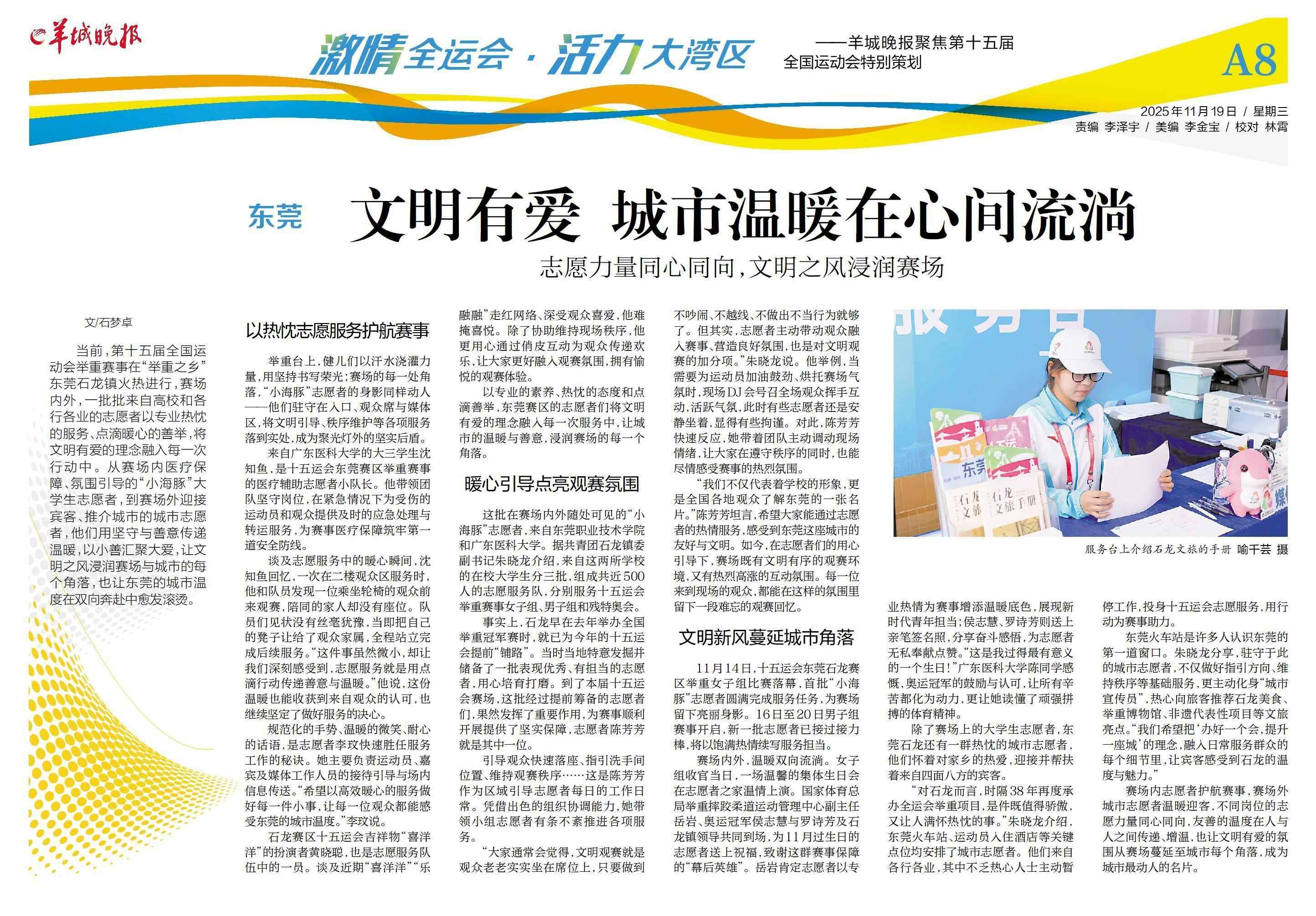 当前,第十五届全国运动会举重赛事在“举重之乡”东莞石龙镇火热进行,赛场内外,一批批来自高校和各行各业的志愿者以专业热忱的服务、点滴暖心的善举,将文明有爱的理念融入每一次行动中。从赛场内医疗保障、氛围引导的“小海豚”大学生志愿者,到赛场外迎接宾客、推介城市的城市志愿者,他们用坚守与善意传递温暖,以小善汇聚大爱,让文明之风浸润赛场与城市的每个角落,也让东莞的城市温度在双向奔赴中愈发滚烫。