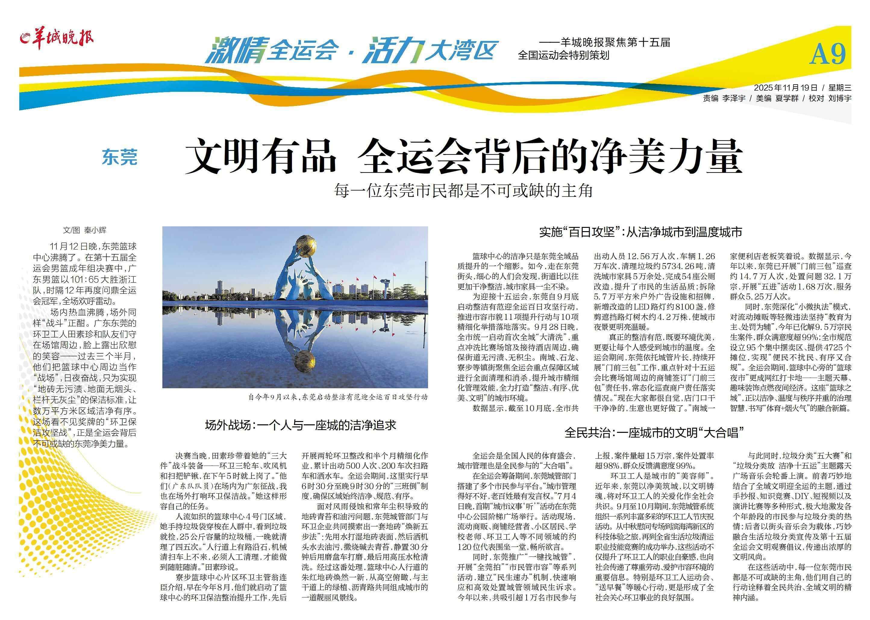 寮步篮球中心片区环卫主管翁连臣介绍,早在今年8月,他们就启动了篮球中心的环卫保洁整治提升工作,先后开展两轮环卫整改和半个月精细化作业,累计出动500人次、200车次扫路车和洒水车。全运会期间,这里实行早6时30分至晚9时30分的“三班倒”制度,确保区域始终洁净、规范、有序。